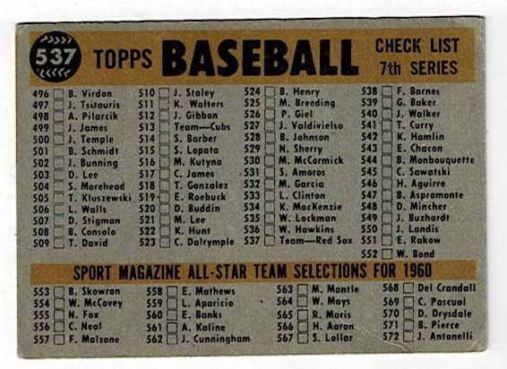 1960 Topps Baseball High Number Boston Red Sox Team #537. This card is in very good condition with corner wear and a small corner crease.