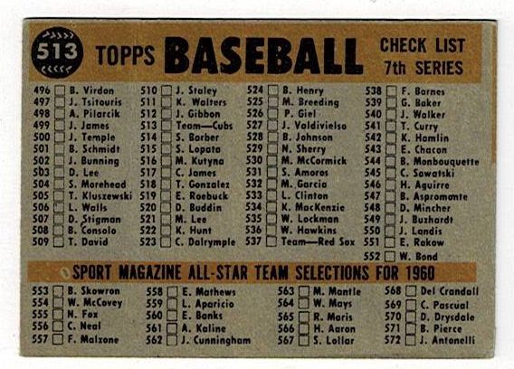 1960 Topps Baseball High Number Chicago Cubs Team #513. This card is in very good condition with corner wear and a small corner crease.