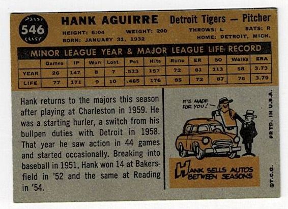 1960 Topps Baseball High Number Hank Aguirre #546. This card is in very good condition with corner wear and no creases.