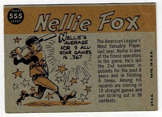 1960 Topps Baseball High Number Nellie Fox All Star #555. This card is in good condition with corner wear and creases.