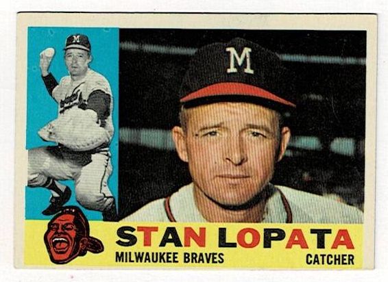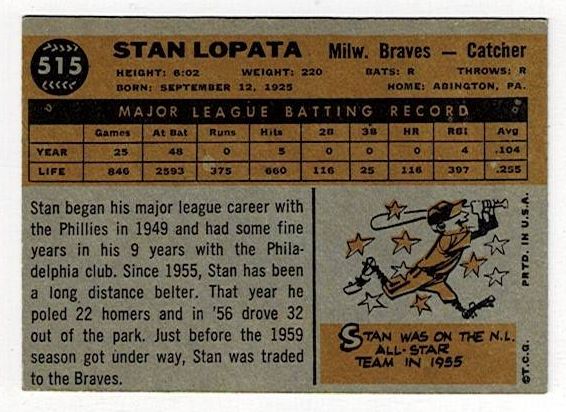 1960 Topps Baseball High Number Stan Lopata #515. This card is in very good condition with corner wear and a crease.