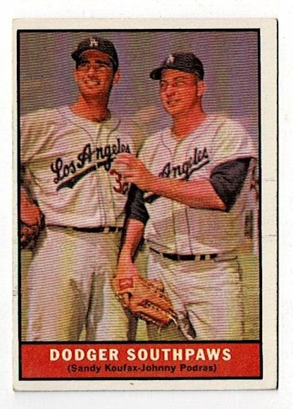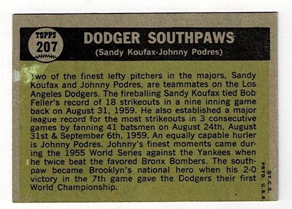 1961 Topps Baseball Dodger Southpaws Sandy Koufax #207. This card is in very good condition with corner wear and no creases.