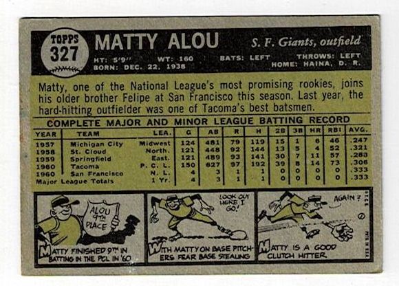 1961 Topps Baseball Matty Alou Rookie #327. This card is in very good condition with corner wear and no creases.