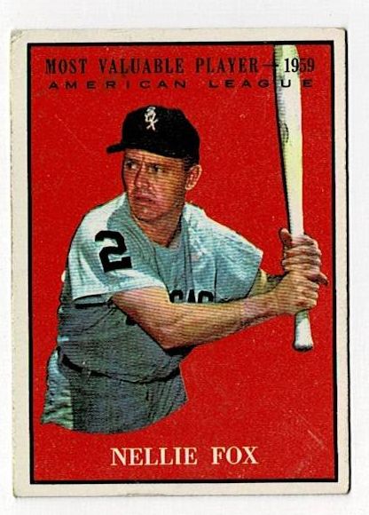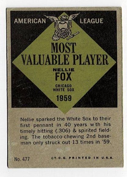 1961 Topps Baseball Nellie Fox MVP #477. This card is in very good condition with corner wear and no creases.