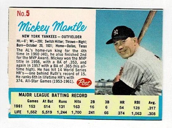 1962 Post Mickey Mantle #5 Life Magazine. This card is in good condition with corner wear and a rough cut on the side.