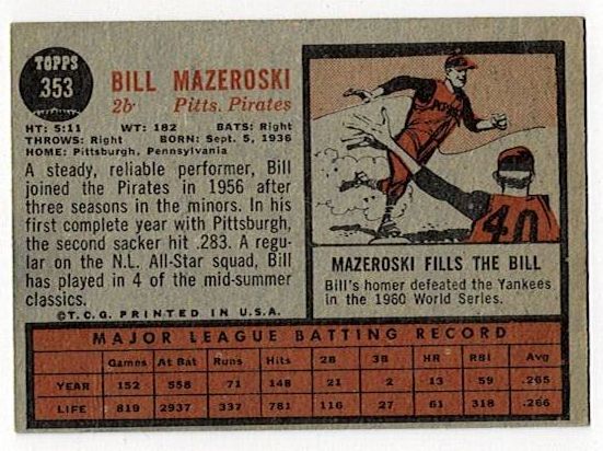 1962 Topps Bill Mazeroski #353. The card is in very good condition with corner wear.