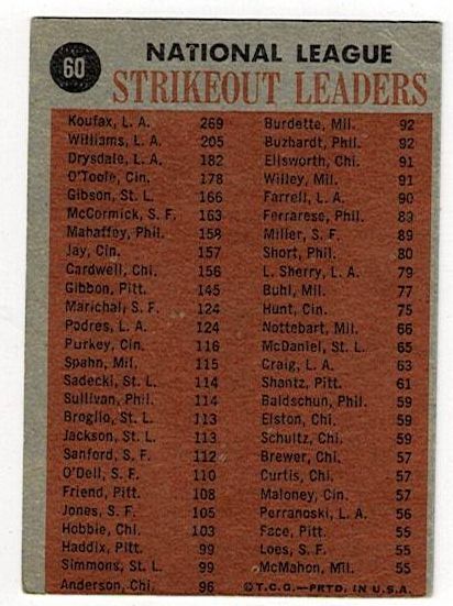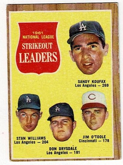 1962 Topps NL Strikeout Leaders Sandy Koufax #60. The card is in good condition with corner wear and a corner crease.