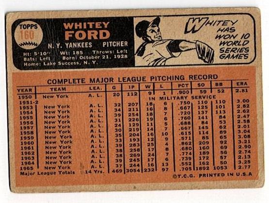 1966 Topps Whitey Ford #160. The card is in good condition with corner wear and a surface wrinkle.