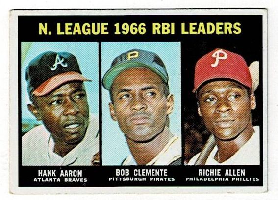 1967 Topps NL 1966 RBI Leaders Hank Aaron Roberto Clemente #242. The card is in very good condition with corner wear.