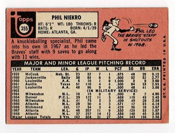 1969 Topps Phil Niekro #355. The card is in very good condition with corner wear.