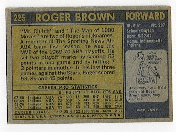 1971-72 Topps Basketball Roger Brown Rookie #225. The card is in excellent condition with corner wear.