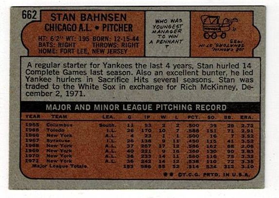 1972 Topps Stan Bahnsen Signed and Inscribed Card
