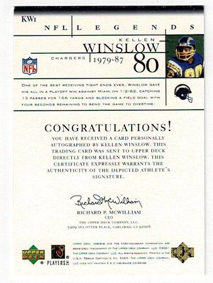 / 2001 Upper Deck NFL Legends Autograph Kellen Winslow