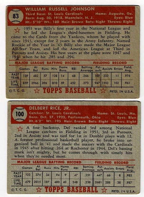 Lot of 2 1952 Topps Baseball Cards St. Louis Cardinals