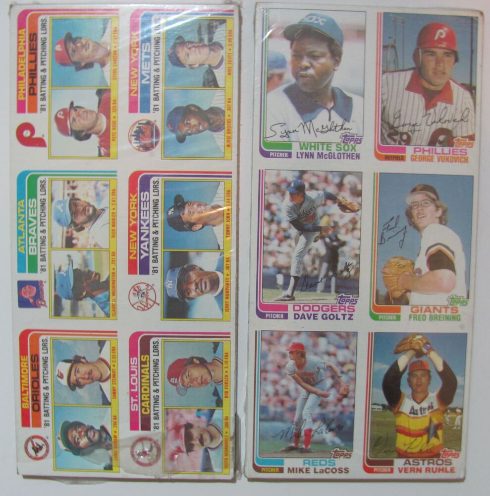 This lot contains 2 packs of 19821 Topps cards. They are in uncut sheets with 6 cards per sheet. Both are factory wrapped with a price sticker. The wrapping on one of the packs is torn on the back.