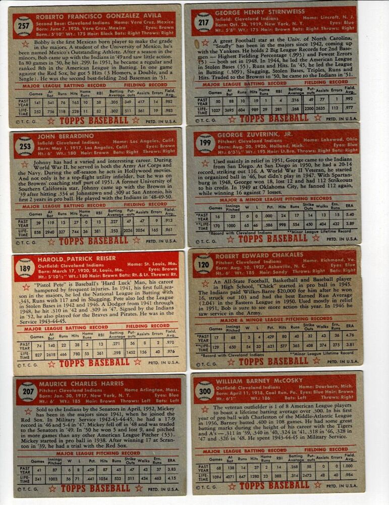 / Lot of 8 1952 Topps Baseball Cards Cleveland Indians